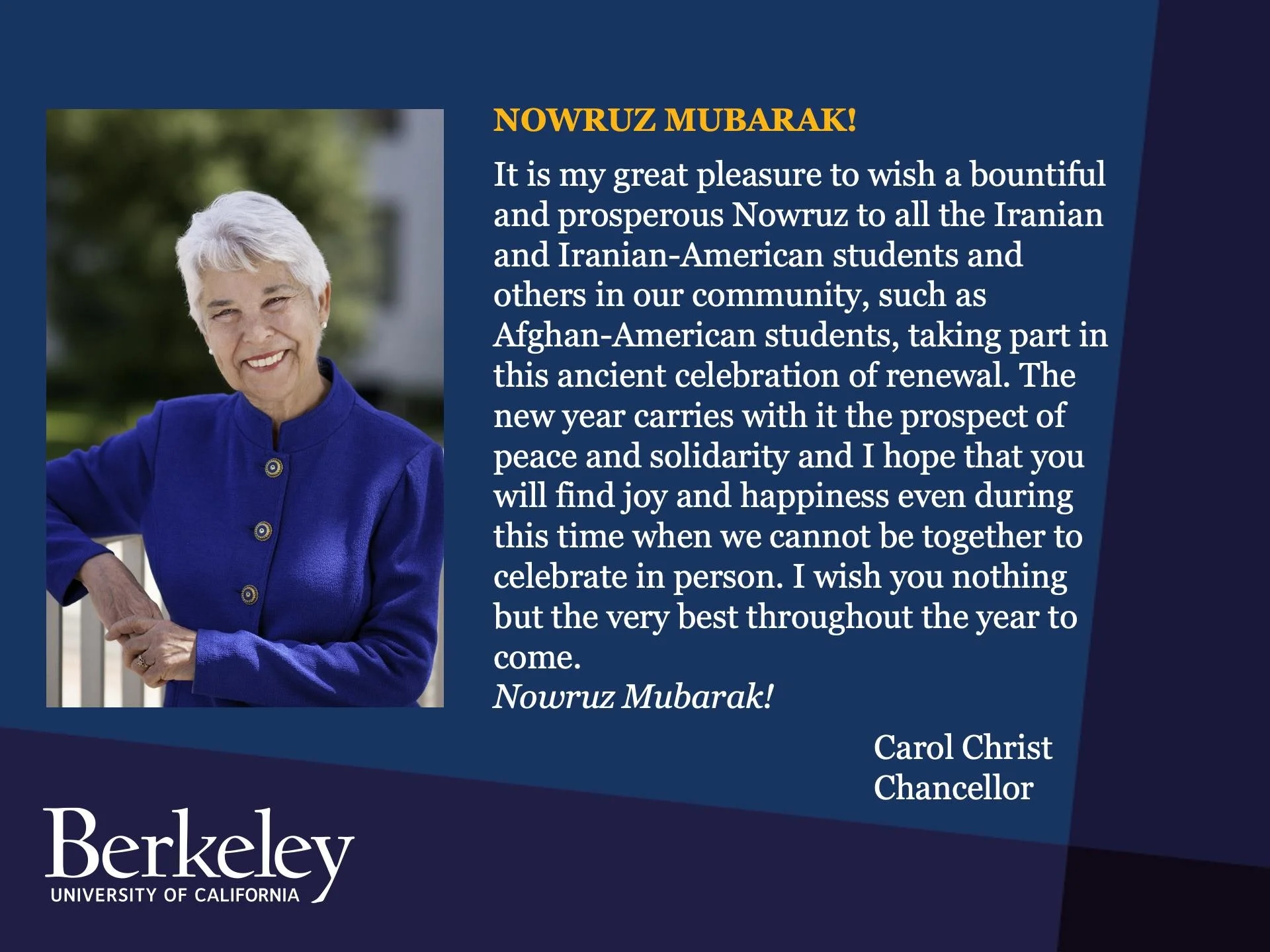 On behalf of all the Iranian graduate students at UC Berkeley, ISAA officers would like to take this opportunity to welcome you to UC Berkeley. We are here for you.